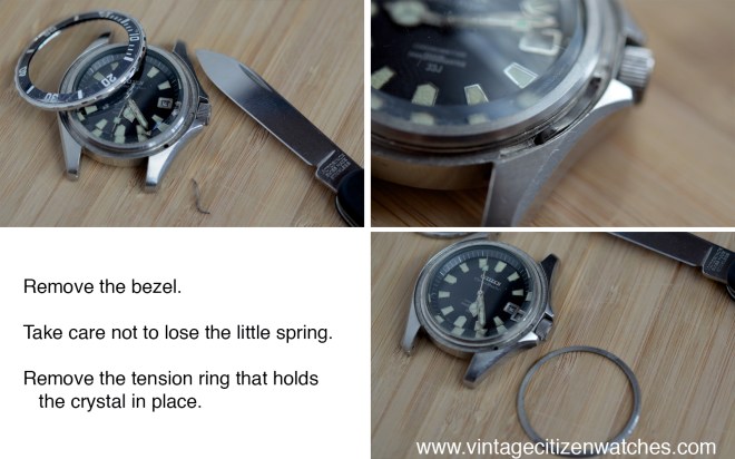 Use the knife to (carefully) force the bezel out. Just stick it under it (I use a small cotton fabric to wrap around the blade so I can protect the watch from scratches) and put a little force using the lug as a lever. It will pop right out. Be careful not to lose the small metal spring that is located in a small space and inserted in a hole at 4 o clock under the bezel. It is there so that we can have the unidirectional 60 clicks action of the diving bezel. Then remove the tension ring that holds the crystal, using the same knife. No fabric this time because there is no space. Take your time, it is not difficult at all.