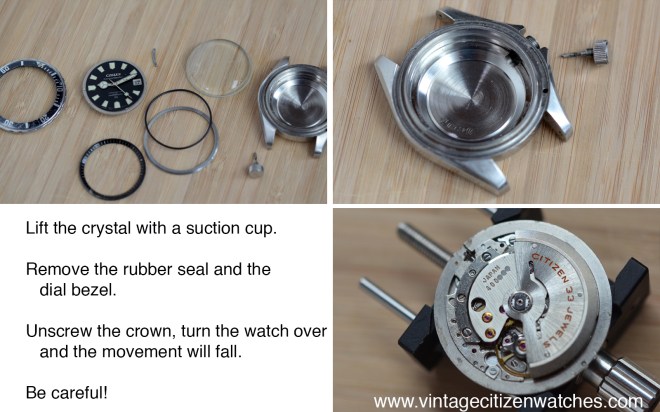 Let’s pretend you have the watch (congratulation if you do!) and without going to the watchmaker, because you get bored on your Christmas / New Year vacation, you decide you have nothing else better to do than spending your time removing the movement of the most rare and expensive Vintage Citizen Watch ever.