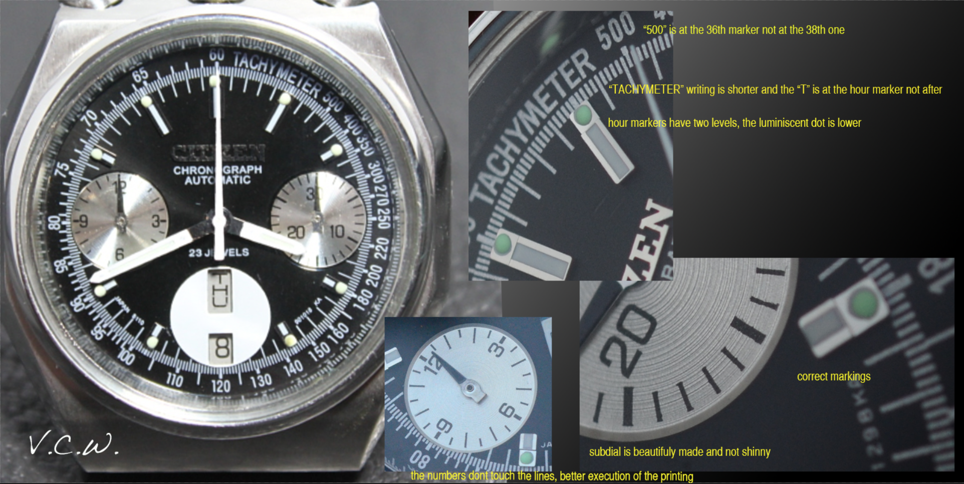 One of the most replicated (so called “aftermarket”) dials for vintage Citizen watches is the dial for the wellknown “bullhead” chronograph. The original bullhead dial, the one with an octagonal SS case is either black with white sub-dials or white with black sub-dials. If you see one with a different color, for sure, it is not original. Sometimes you can find one that looks just the way it should, but let’s wait a minute. Let’t put on the magnifier and compare the original dial with the fake one.