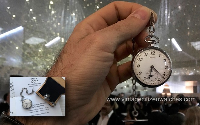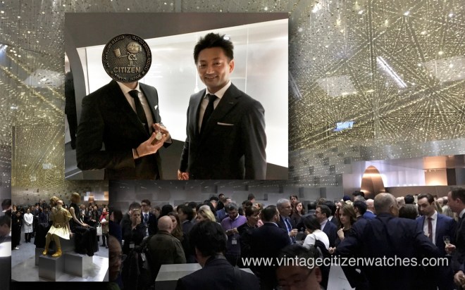 So… we got our Press badges, entered the fair and took a short look at the Swiss watches. They were really cool and are covered on-line everywhere, but the main reason for our visit was Citizen, so finding the booth was the main goal. It was easy to find. We could’t linger, so back to the hotel we went for a shower and dressing up for the party. The watch I took with me was the first Citizen ever made, the pocket watch. It felt like the perfect choice and I was not wrong. I also had some original Citizen made accessories, with Citizen movements, tie pin and cufflinks that fitted the occasion and the location nicely. In fact, what you see in the pictures as shining little stars hanging from the Citizen booth ceiling were nothing else but thousands of Citizen movements. The design was spectacular and here it is what Tsuyoshi TaneAtelier Tsuyoshi Tane Architects says about it:
